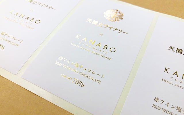 チョコレート商品が入ったクラフトパッケージにラベルシールの印刷実績です。